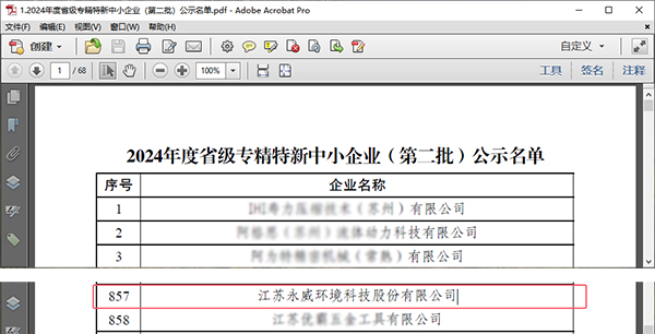 永威環(huán)境憑借其卓越的專業(yè)實(shí)力、持續(xù)的創(chuàng)新能力以及深耕細(xì)分領(lǐng)域的突出成果,榮獲江蘇省工業(yè)和信息化廳頒發(fā)的“江蘇省2024年度省級(jí)專精特新中小企業(yè)”稱號(hào),這是對(duì)公司多年來(lái)砥礪奮進(jìn)的高度認(rèn)可,進(jìn)一步鞏固了其在環(huán)境領(lǐng)域的領(lǐng)先地位。